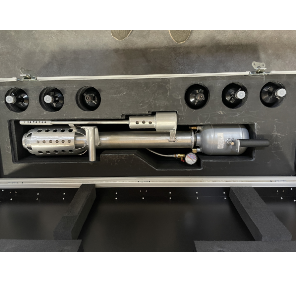 Air Cannon leveres klar til brug med flasker. Kanonen kan affyre flere T-shirts hurtigt og giver en stabil og præcis affyring.